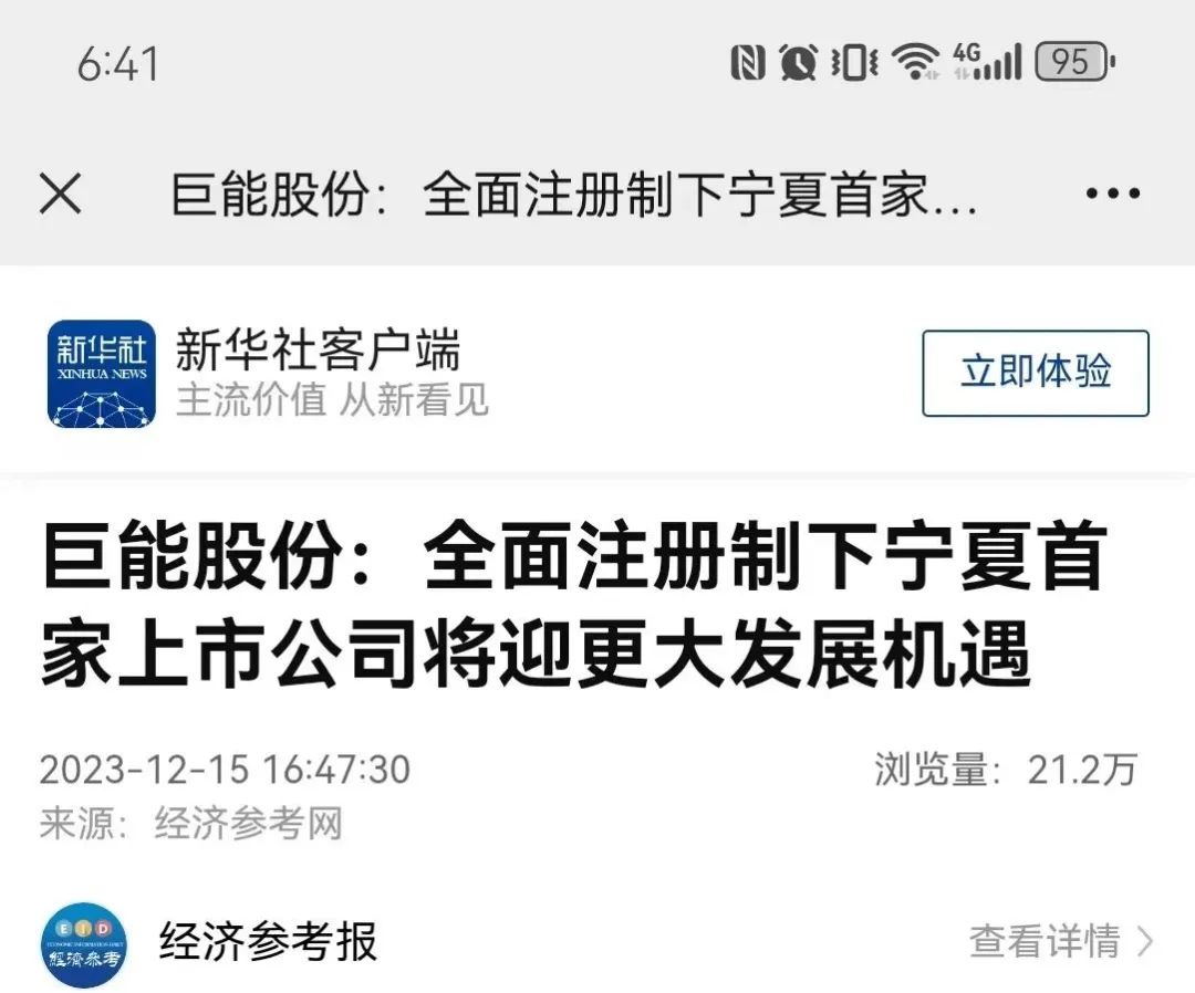 【題記】2023年12月15日,新華社客戶端刊發(fā)《巨能股份:全面注冊制下寧夏首家上市公司將迎來更大發(fā)展機遇》(詳情見原文鏈接),以下為報道全文。
