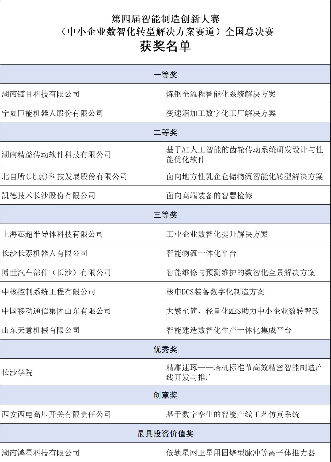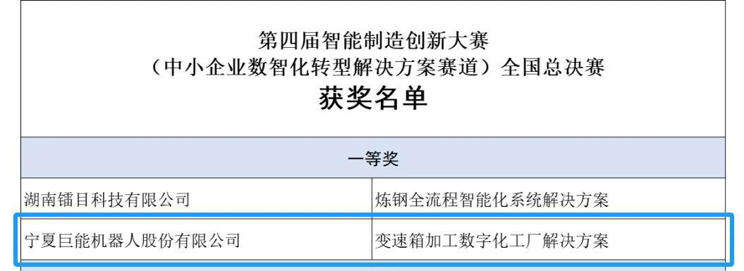 12月5日,第四屆智能制造創(chuàng)新大賽(中小企業(yè)數(shù)智化轉(zhuǎn)型解決方案賽道)全國(guó)總決賽在湖南長(zhǎng)沙舉行。巨能機(jī)器人憑《變速箱加工數(shù)字化工廠解決方案》榮獲本屆大賽一等獎(jiǎng)。