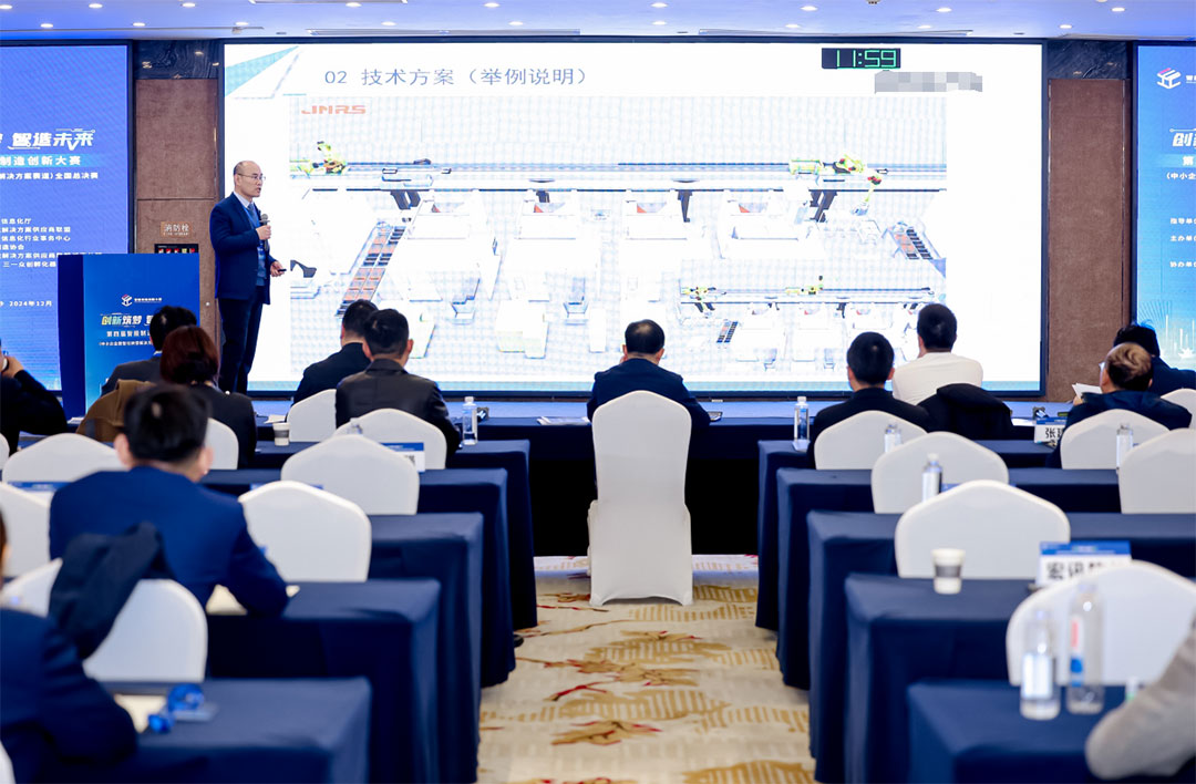 30支來自全國(guó)各地的參賽隊(duì)伍以“路演+答辯”的方式一比高下。巨能機(jī)器人公司總工程師宋明安現(xiàn)場(chǎng)進(jìn)行的主題路演?!蹲兯傧浼庸?shù)字化工廠解決方案》面對(duì)商用車變速器零部件加工的智改數(shù)轉(zhuǎn)需求,重點(diǎn)解決了變速箱零件自動(dòng)化工藝集、數(shù)字化工廠的整體規(guī)劃、零部件制造全過程自動(dòng)化追溯等問題,通過部署工業(yè)機(jī)器人、機(jī)器視覺識(shí)別、在線智能檢測(cè)、自動(dòng) AGV 倉(cāng)儲(chǔ)與物流裝備等智能制造裝備,運(yùn)用人工智能等新一代信息技術(shù),以生產(chǎn)制造環(huán)節(jié)為典型應(yīng)用場(chǎng)景,提供了小型化、精準(zhǔn)化的智能制造系統(tǒng)解決方案。