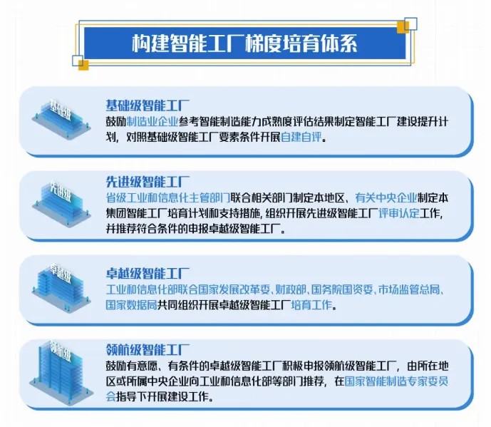 【鏈接:智能工廠梯度培育體系】2024年,工業(yè)和信息化部、國(guó)家發(fā)展改革委、財(cái)政部、國(guó)務(wù)院國(guó)資委、市場(chǎng)監(jiān)管總局、國(guó)家數(shù)據(jù)局等六部門聯(lián)合印發(fā)通知,部署開展2024年度智能工廠梯度培育行動(dòng)。明確將構(gòu)建智能工廠梯度培育體系,按照《智能工廠梯度培育行動(dòng)實(shí)施方案》《智能工廠梯度培育要素條件》,分基礎(chǔ)級(jí)、先進(jìn)級(jí)、卓越級(jí)和領(lǐng)航級(jí)四個(gè)層級(jí)開展智能工廠梯度培育。