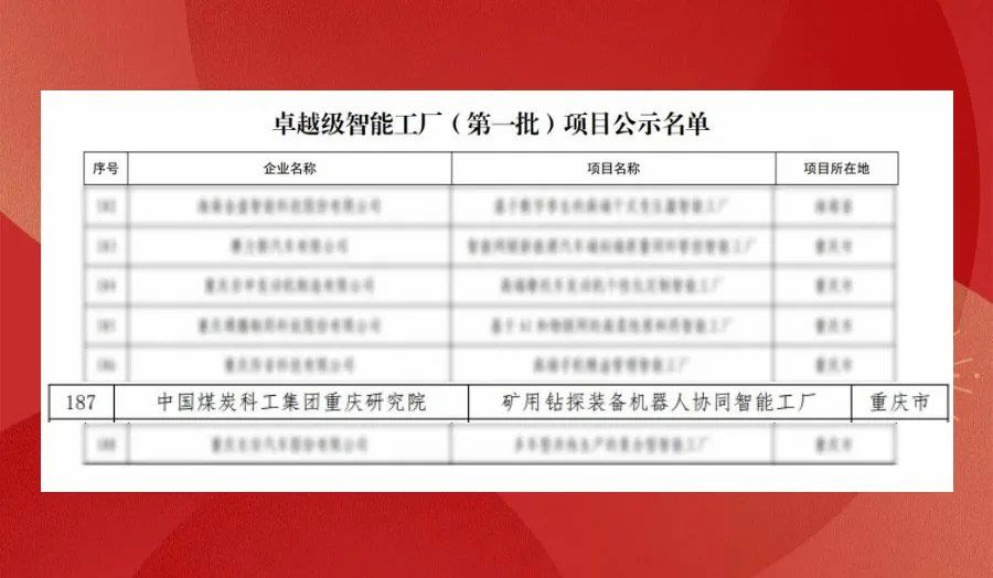 近日,工業(yè)和信息化部發(fā)布了《關(guān)于卓越級(jí)智能工廠(第一批)項(xiàng)目的公示》。重慶研究院的“礦用鉆探裝備機(jī)器人協(xié)同智能工廠”成功入選。
