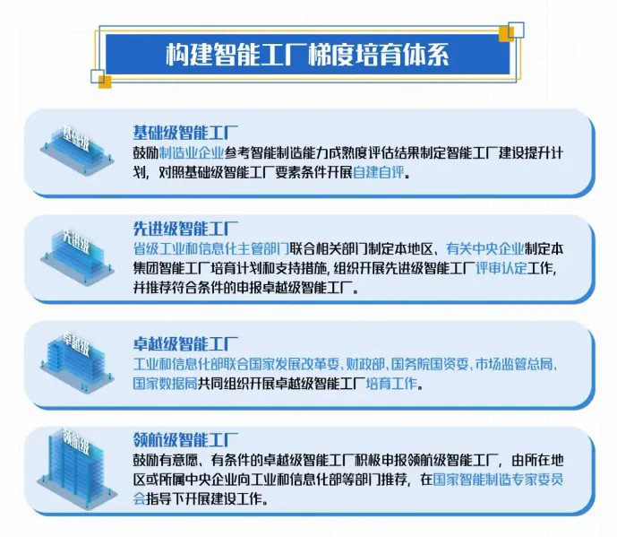 【鏈接:智能工廠梯度培育體系】2024年,工業(yè)和信息化部、國家發(fā)展改革委、財(cái)政部、國務(wù)院國資委、市場(chǎng)監(jiān)管總局、國家數(shù)據(jù)局等六部門聯(lián)合印發(fā)通知,部署開展2024年度智能工廠梯度培育行動(dòng)。明確將構(gòu)建智能工廠梯度培育體系,按照《智能工廠梯度培育行動(dòng)實(shí)施方案》《智能工廠梯度培育要素條件》,分基礎(chǔ)級(jí)、先進(jìn)級(jí)、卓越級(jí)和領(lǐng)航級(jí)四個(gè)層級(jí)開展智能工廠梯度培育。